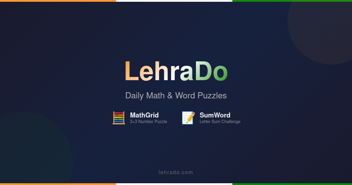 LehraDo is a free daily brain game website. Every day at midnight IST, six brand-new puzzles go live โ a math puzzle, a word puzzle, a number target game, and a word fragment challenge. No signup, no ads wall, no app download. Just open your browser and play. The name comes from "Lehra Do" ๐ โ a rallying cry that means "raise the flag" โ and that's exactly what we want you to do with your brainpower.
